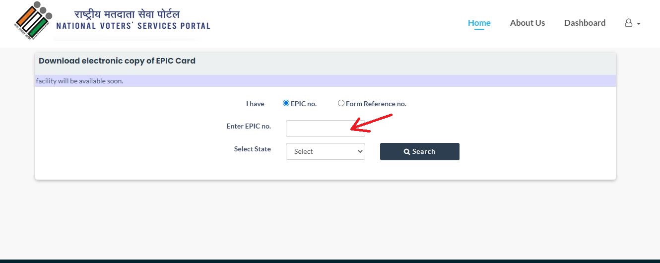· Enter EPIC Number or Form Reference No · Select State · Click on Search |